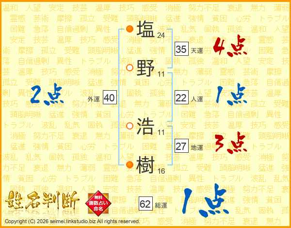 塩(24画)野(11画) 浩(11画)樹(16画)