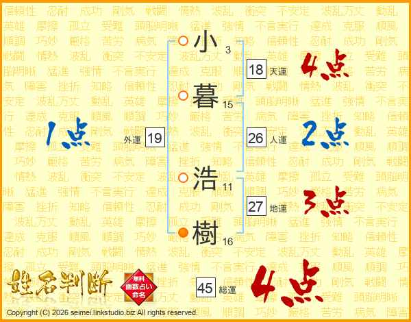 小(3画)暮(15画) 浩(11画)樹(16画)