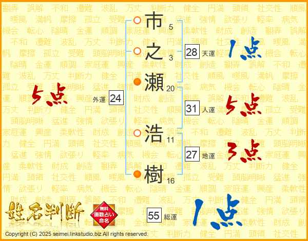 市(5画)之(3画)瀬(20画) 浩(11画)樹(16画)