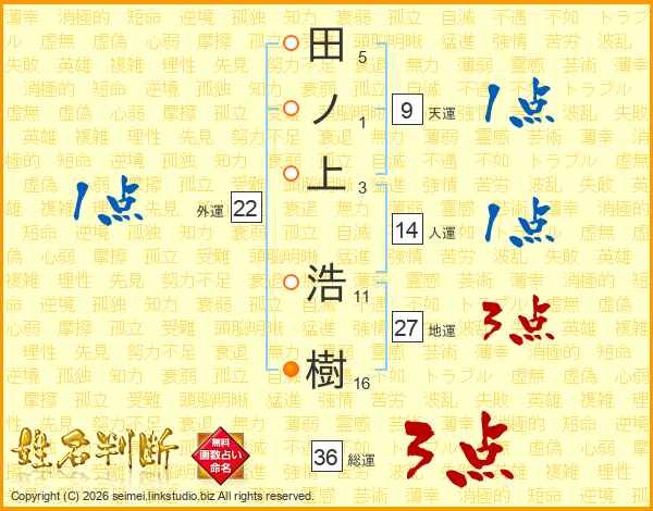 田(5画)ノ(1画)上(3画) 浩(11画)樹(16画)