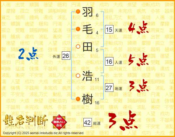 羽(6画)毛(4画)田(5画) 浩(11画)樹(16画)