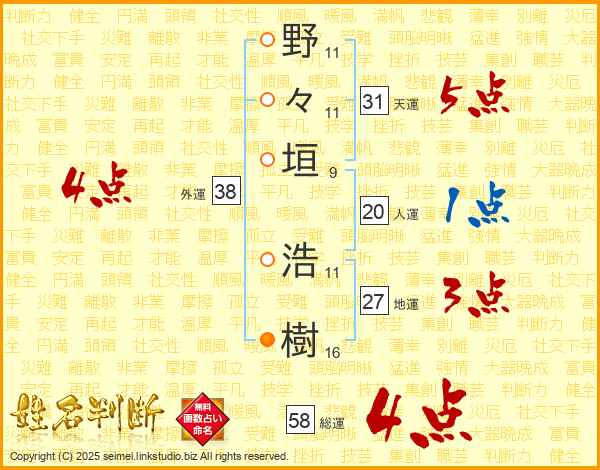 野(11画)々(11画)垣(9画) 浩(11画)樹(16画)