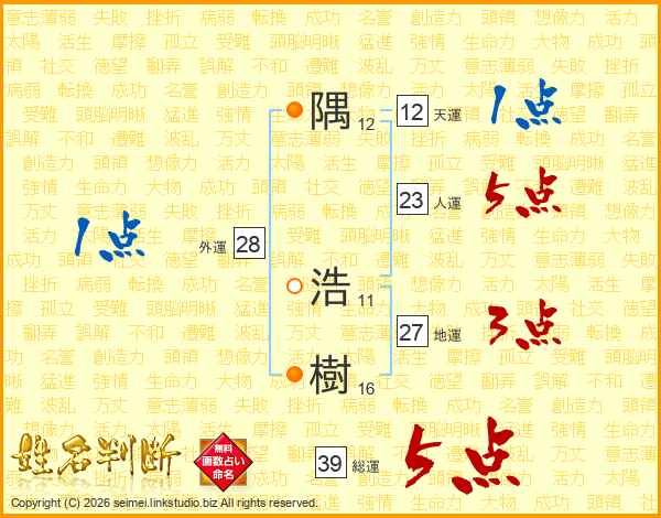 あなたの人生を表す1番重要な運勢です。生涯を通じて影響する総合運となり、主に50歳以降の晩年期に影響を及ぼします。苗字と名前の合計画数。