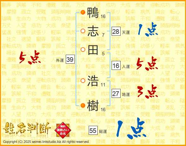 鴨(16画)志(7画)田(5画) 浩(11画)樹(16画)