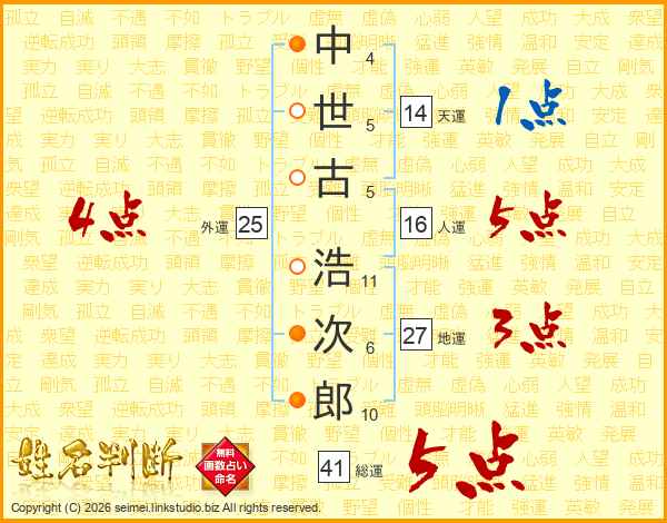 中(4画)世(5画)古(5画) 浩(11画)次(6画)郎(10画)