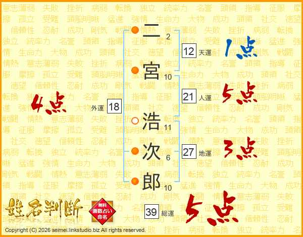 二宮浩次郎さんの総運は39画の5点!
