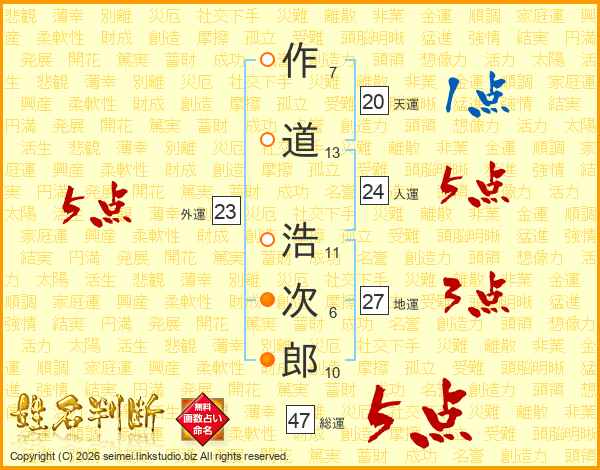 作(7画)道(13画) 浩(11画)次(6画)郎(10画)