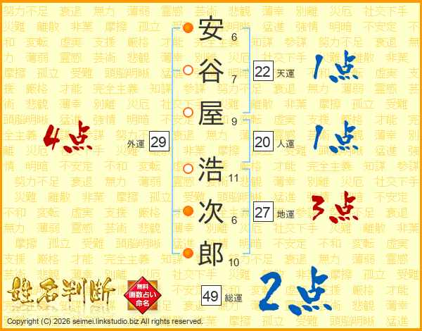 安(6画)谷(7画)屋(9画) 浩(11画)次(6画)郎(10画)