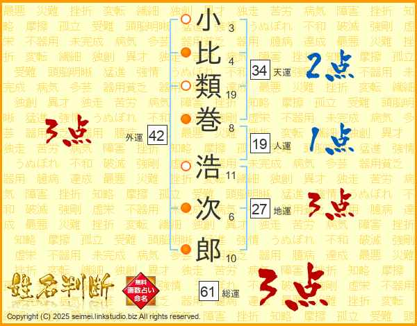 小(3画)比(4画)類(19画)巻(8画) 浩(11画)次(6画)郎(10画)