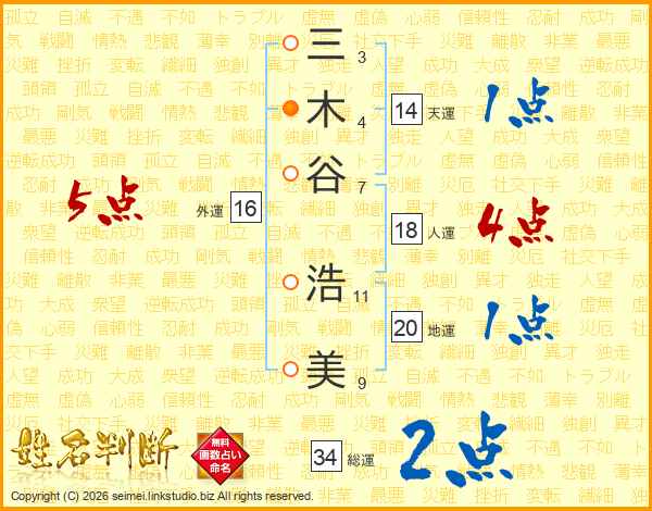 三(3画)木(4画)谷(7画) 浩(11画)美(9画)
