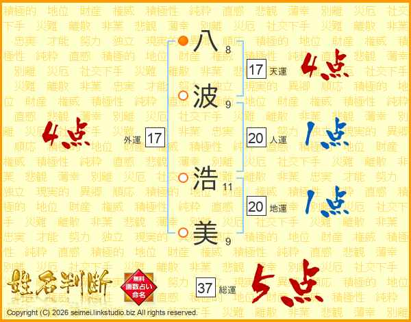 八(8画)波(9画) 浩(11画)美(9画)