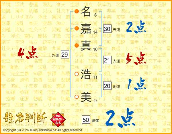 名(6画)嘉(14画)真(10画) 浩(11画)美(9画)