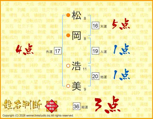 松(8画)岡(8画) 浩(11画)美(9画)