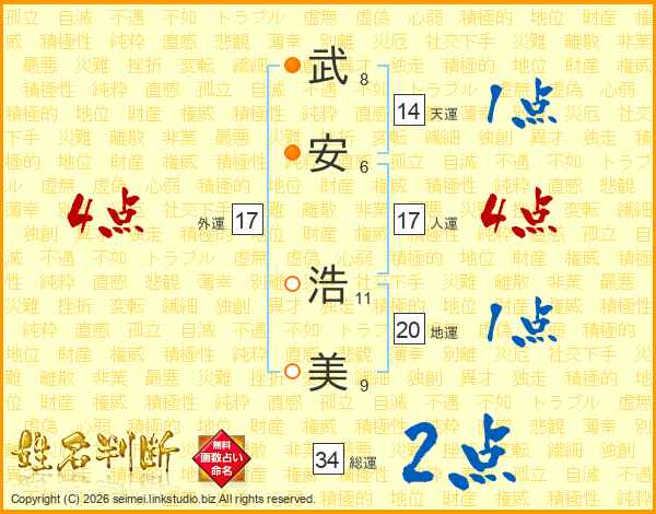 武(8画)安(6画) 浩(11画)美(9画)