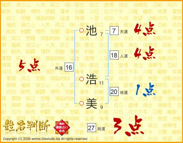 あなたの人生を表す1番重要な運勢です。生涯を通じて影響する総合運となり、主に50歳以降の晩年期に影響を及ぼします。苗字と名前の合計画数。