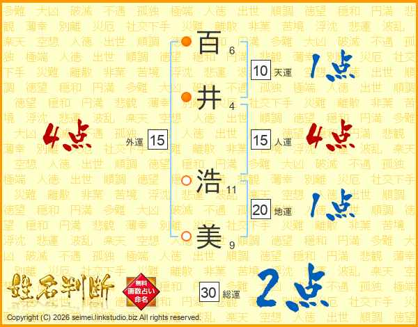 あなたの人生を表す1番重要な運勢です。生涯を通じて影響する総合運となり、主に50歳以降の晩年期に影響を及ぼします。苗字と名前の合計画数。