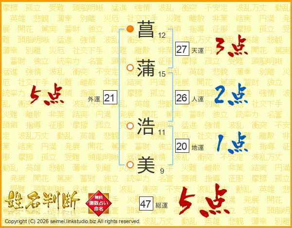 菖(12画)蒲(15画) 浩(11画)美(9画)