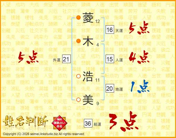 あなたの人生を表す1番重要な運勢です。生涯を通じて影響する総合運となり、主に50歳以降の晩年期に影響を及ぼします。苗字と名前の合計画数。