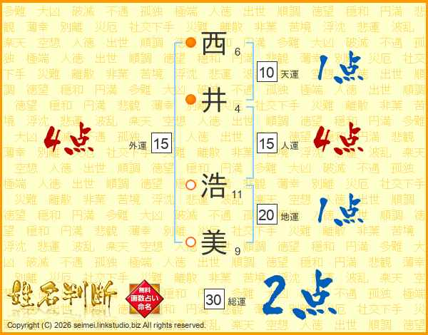 画数の奇数(○陽)と偶数(●陰)の配列で吉凶を占います。どちらかにかたよる名前は大凶名で避ける必要があります。画数の奇数偶数。