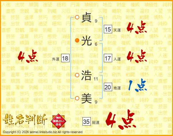 貞(9画)光(6画) 浩(11画)美(9画)