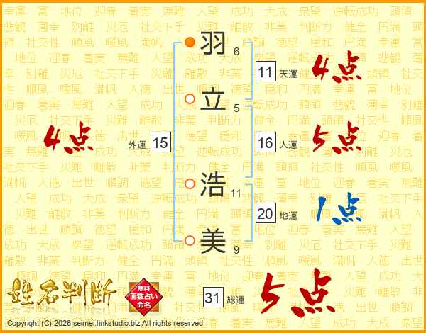 羽(6画)立(5画) 浩(11画)美(9画)