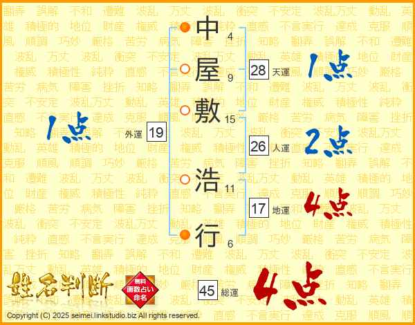 中屋敷浩行さんの総運は45画の4点!
