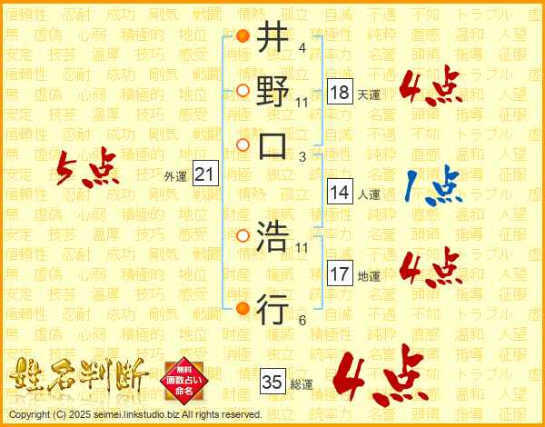 井(4画)野(11画)口(3画) 浩(11画)行(6画)