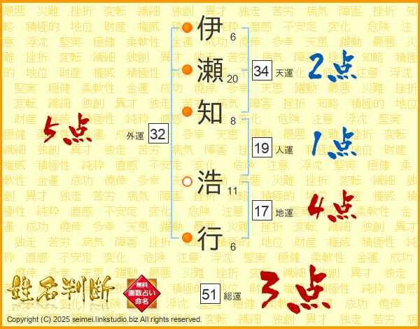 伊(6画)瀬(20画)知(8画) 浩(11画)行(6画)