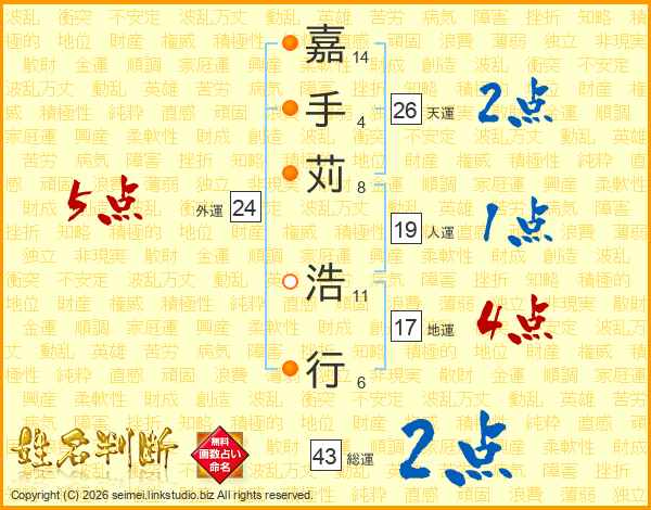 嘉(14画)手(4画)苅(8画) 浩(11画)行(6画)