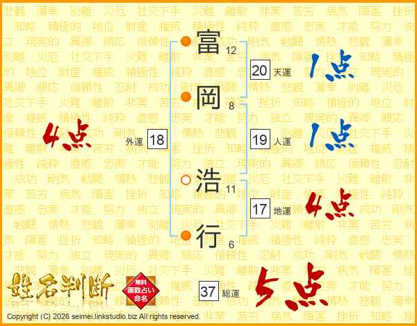 富(12画)岡(8画) 浩(11画)行(6画)