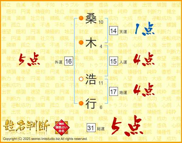 生活面を象徴する運勢です。外部から受ける影響力を表し、結婚運、家庭運や職場、環境への順応性を表します。総運から人運を引いた画数。姓や名が1文字の場合を除く。
