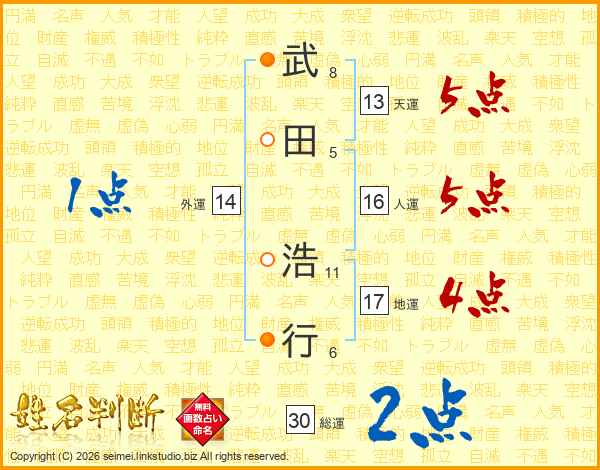 武(8画)田(5画) 浩(11画)行(6画)
