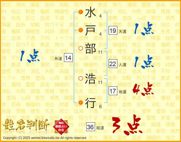 水(4画)戸(4画)部(11画) 浩(11画)行(6画)
