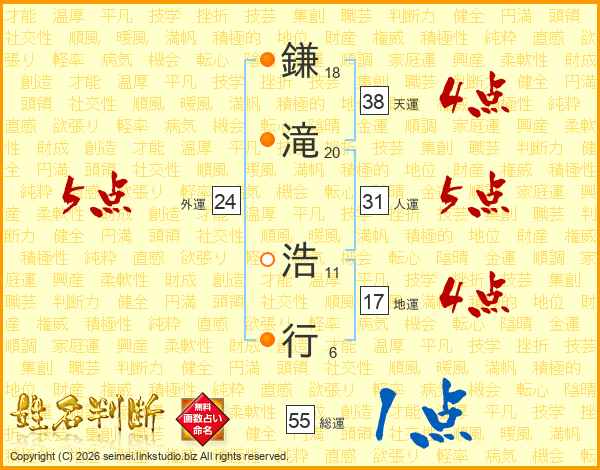 鎌(18画)滝(20画) 浩(11画)行(6画)