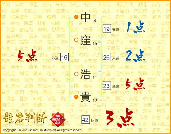中(4画)窪(15画) 浩(11画)貴(12画)