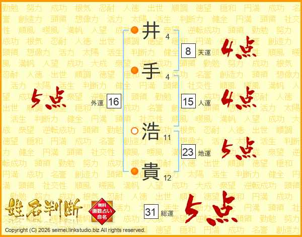 井(4画)手(4画) 浩(11画)貴(12画)