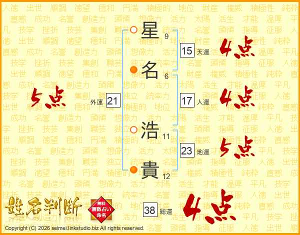 星(9画)名(6画) 浩(11画)貴(12画)