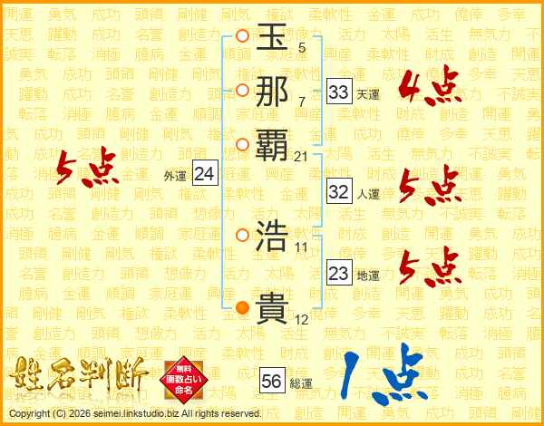 玉(5画)那(7画)覇(21画) 浩(11画)貴(12画)