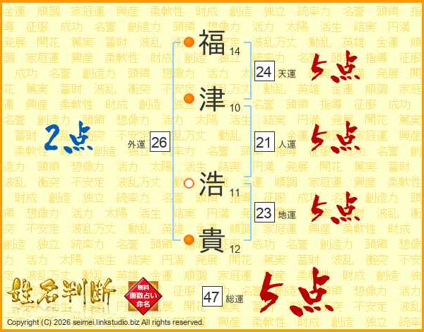 福(14画)津(10画) 浩(11画)貴(12画)