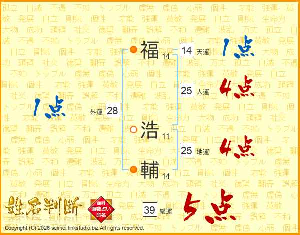 あなたの人生を表す1番重要な運勢です。生涯を通じて影響する総合運となり、主に50歳以降の晩年期に影響を及ぼします。苗字と名前の合計画数。