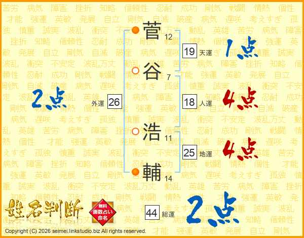 菅(12画)谷(7画) 浩(11画)輔(14画)