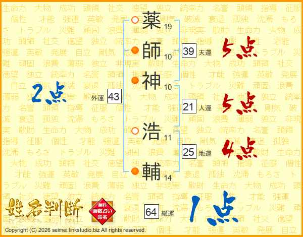 薬(19画)師(10画)神(10画) 浩(11画)輔(14画)