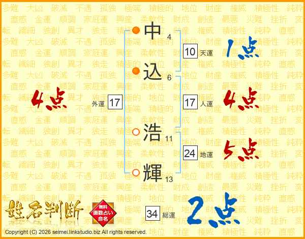 あなたの人生を表す1番重要な運勢です。生涯を通じて影響する総合運となり、主に50歳以降の晩年期に影響を及ぼします。苗字と名前の合計画数。