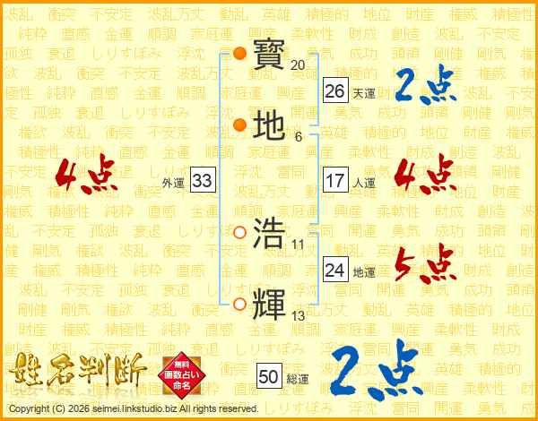 寳(20画)地(6画) 浩(11画)輝(13画)