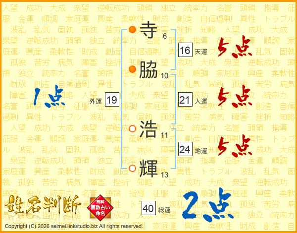 寺(6画)脇(10画) 浩(11画)輝(13画)