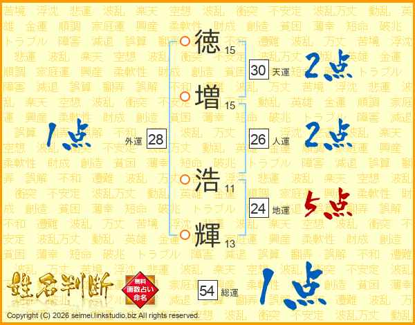 徳(15画)増(15画) 浩(11画)輝(13画)