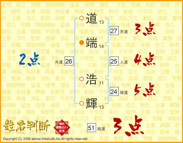 生活面を象徴する運勢です。外部から受ける影響力を表し、結婚運、家庭運や職場、環境への順応性を表します。総運から人運を引いた画数。姓や名が1文字の場合を除く。