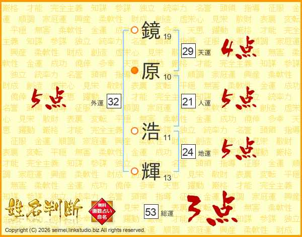 鏡(19画)原(10画) 浩(11画)輝(13画)