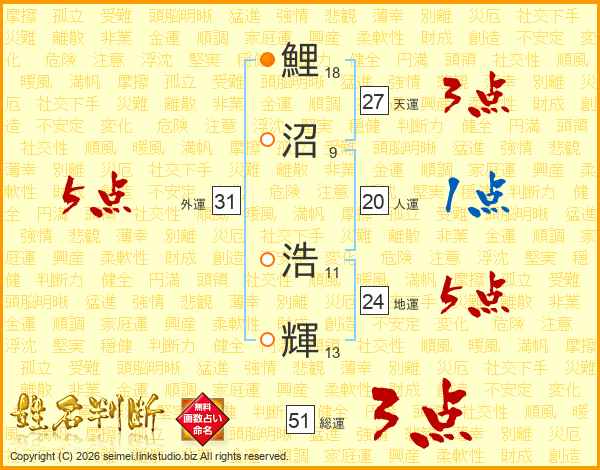 鯉沼浩輝さんの天運は27画の3点!