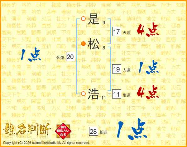 あなたの人生を表す1番重要な運勢です。生涯を通じて影響する総合運となり、主に50歳以降の晩年期に影響を及ぼします。苗字と名前の合計画数。